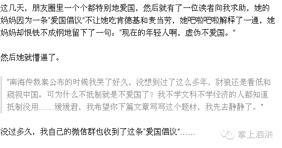 “自从南海仲裁案后,我再没去过肯德基和麦当劳,昨天我女儿要去吃,被我揍了一顿,后来带她去了永和大王。”
