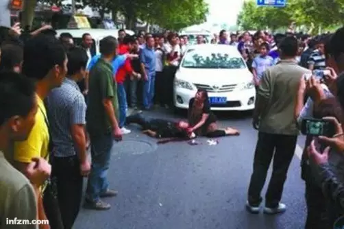 李建利的妻子几近崩溃地跪在路中央,乞求围观群众的帮助。